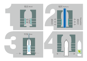 標籤底紙→背面上糊劑→正面印刷(UV平版或UV Flexo印刷後)上光或無→嶄型→置入模具→吹瓶成型→脫模